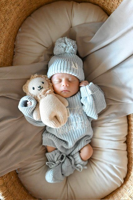 Our sky knit booties are designed to match with our embroidered "little brother" knit romper & knit pom beanie in sky. Purchase individually or as a set (see bundles page).